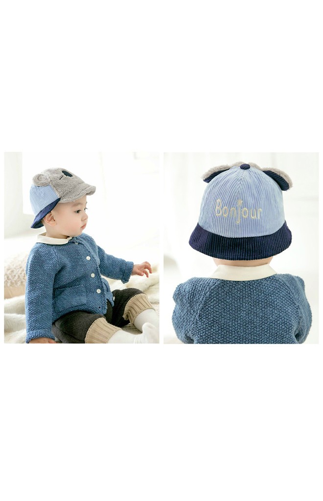 หมวกเด็ก 2 ทรง ด้านหน้าแก๊ปหน้าหมีขนฟู ด้านหลังบักเก็ตผ้าลูกฟูกปัก Bonjour
