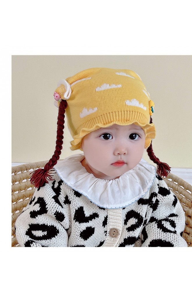 หมวกเปียลายเมฆแต่งตุ๊กตาสัตว์น่ารัก ขอบระบาย