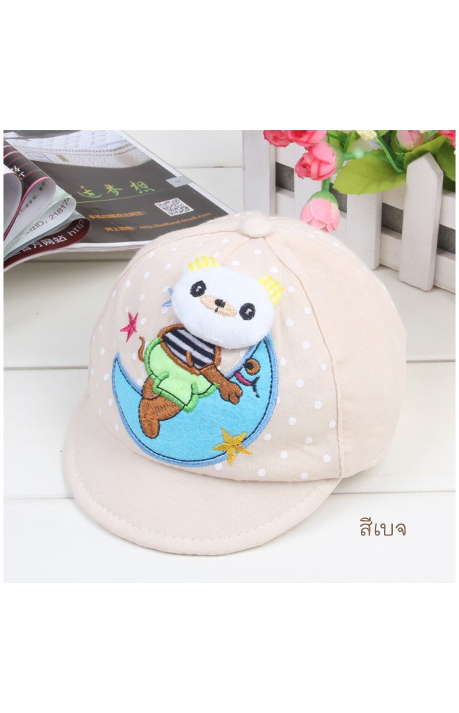 หมวกแก๊ปเด็กเนื้อผ้าฝ้ายแต่งรูปหมีและพระจันทร์ ด้านหลังเป็นยางยืด รอบหมวก 42 ซม. สำหรับเด็กอายุประมาณ 1-5 เดือน ใส่ได้ทั้งเด็กชายและเด็กหญิง