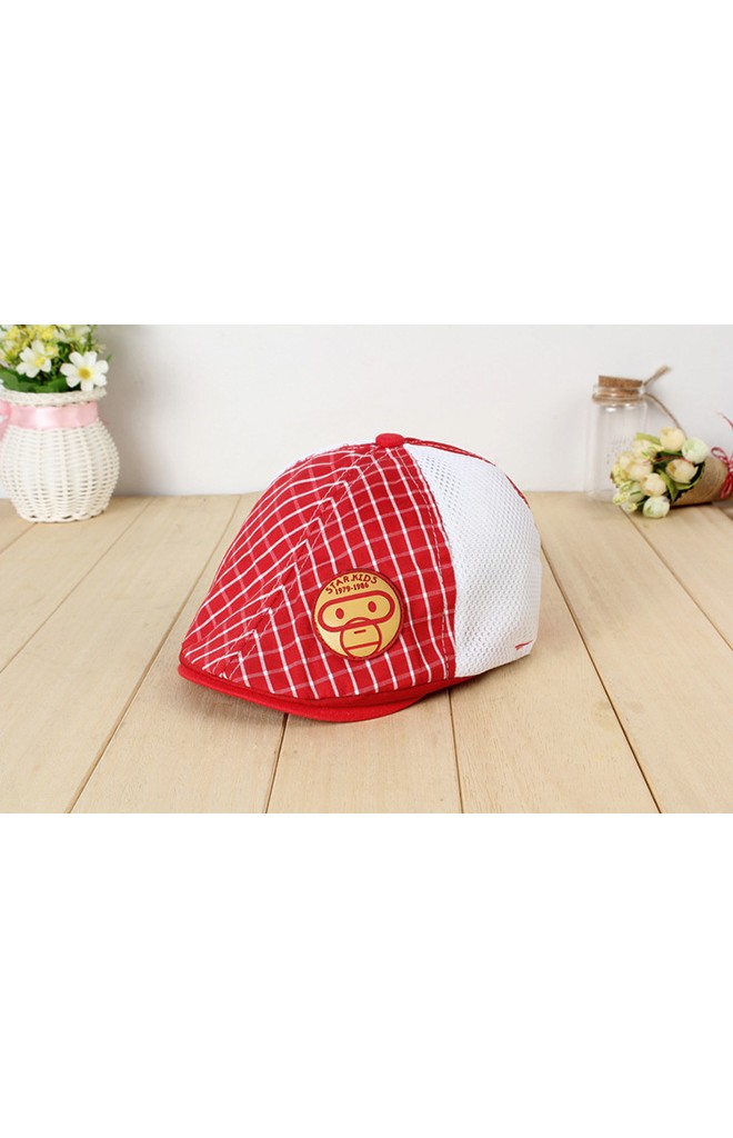 หมวกแฟล็ตแค็ปผ้าลายตารางแต่งหน้าลิง ครึ่งหลังผ้าตาขาย ด้านหลังยางยืดใส่กระชับศีรษะ ไซส์ 48 ซม. สำหรับเด็กอายุประมาณ 6 เดือน - 1 ปีครึ่ง มีให้เลือก 4 สี น้ำเงินกรมท่า แดง ฟ้า และ เขียว