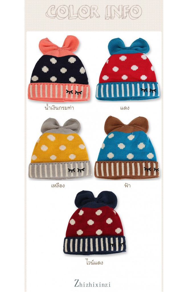 หมวกไหมพรมลายจุดแต่งโบว์ด้านบนน่ารัก