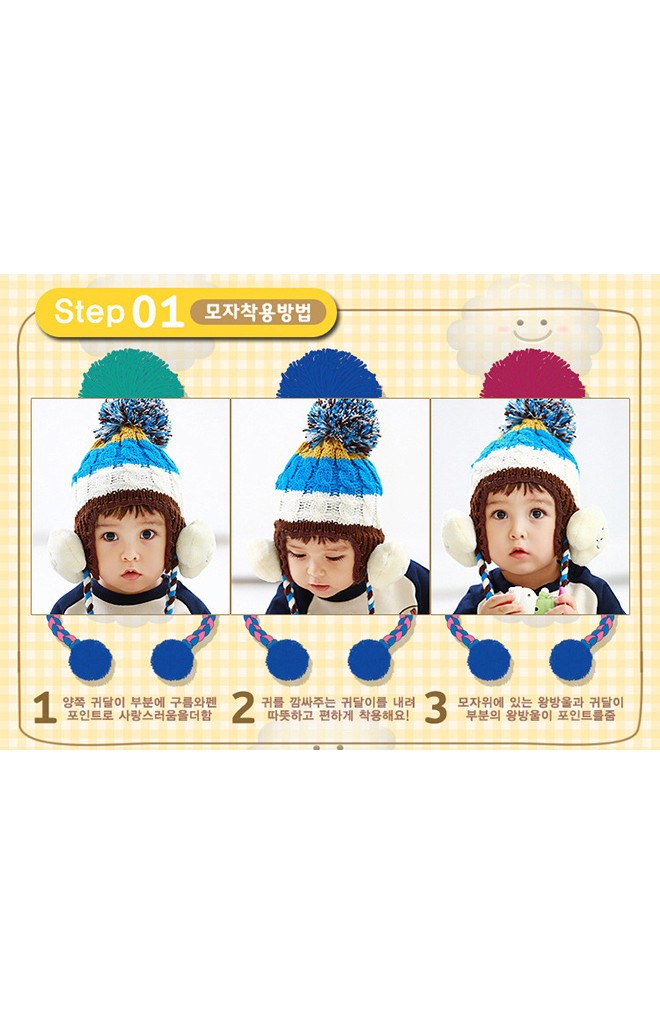 หมวกไหมพรมลายรุ้งสลับสี ด้านข้างหูแต่งตุ๊กตาเมฆน้อย ห้อยปอมปอม kocotree