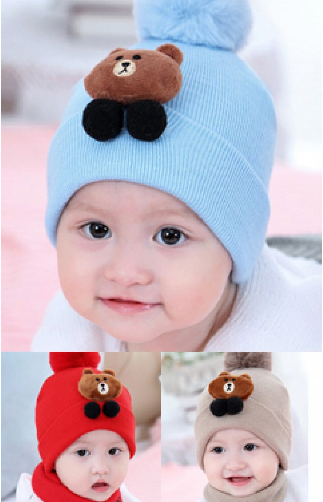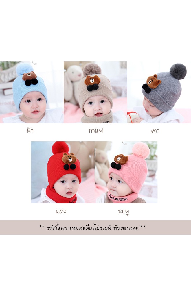 หมวกไหมพรมเด็กแต่งหมีน้ำตาลด้านบนปอมๆ ขนมิ้ง หมวกบีนนี่น่ารักจะใส่เวลาอยู่ห้องปรับอากาศหรืออากาศหนาวก็อุ่นสบาย ใส่ได้ทั้งเด็กชายและเด็กหญิง มีให้เลือก 4 สี แดง ฟ้า เทา และ ชมพูขนาดหมวก: รอบหมวก 31 ซม. ยืดได้ประมาณ 46 ซม. สำหรับเด็กอายุประมาณ 1-8 เดือน