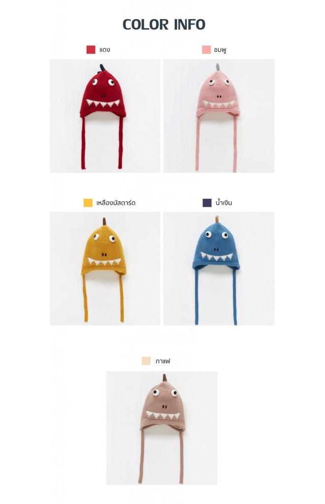 หมวกไหมพรมไดโนเสาร์แบบผูกคาง หมวกกันหนาวน่ารักๆ ใส่ได้ทั้งเด็กชายและเด็กหญิง ด้านในซับผ้ายืด มีให้เลือก 4 สี แดง น้ำเงิน ชมพู และ กาแฟขนาดหมวก: