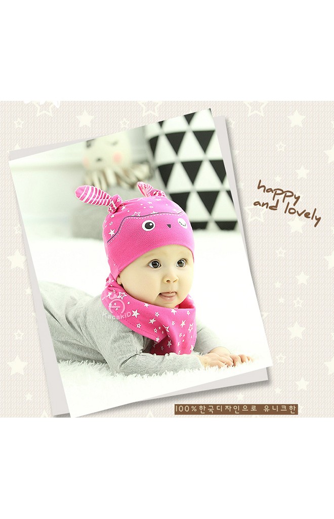 เซ็ตหมวกเด็กเล็กมาพร้อมผ้ากันเปื้อนลายนกฮูก สกรีนรูปดาว