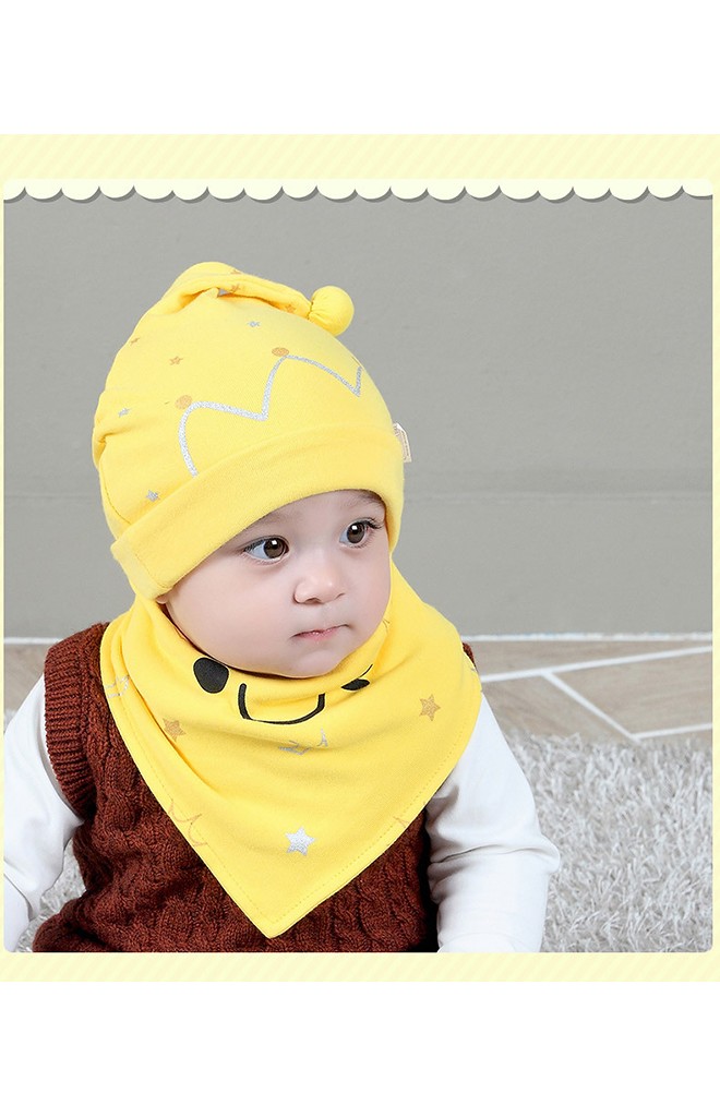 เซ็ตหมวกเด็กเล็กลายมงกุฎและดวงดาวเล็กๆ ปลายหมวกยาวแต่งปอมปอมเล็กน่ารัก มาพร้อมผ้ากันเปื้อนลายเข้าชุดกัน เซ็ตหมวกเด็กอ่อนผ้ายืดน่ารักแบบใหม่ล่าสุดจาก BEINAXI มีให้เลือก 5 สี เหลือง ฟ้า ดำ แดง และ ชมพูขนาด: