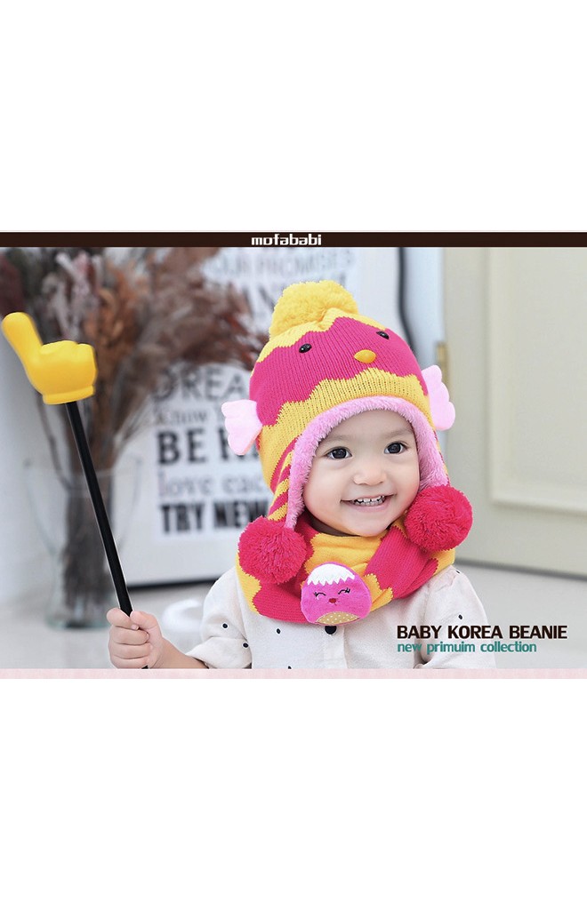 เซ็ตหมวกไหมพรมลูกเจี๊ยบมาพร้อมผ้าสวมคอ จาก MOFABABI ตรงผ้าสวมคอมีเข็มกลัดลูกเจี๊ยบด้วย น่ารักมากๆ ค่ะ ใส่น่ารักได้ทั้งเด็กชายและเด็กหญิง มีให้เลือก 4 สี ชมพูเข้ม, ฟ้า, ฟ้า-ส้มอมน้ำตาล, และ เหลือง-ส้มอมน้ำตาลขนาดหมวก: