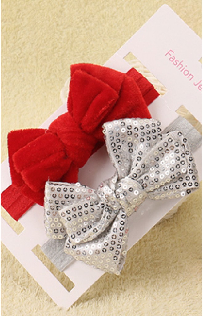 โบว์คาดผมแพ็ค 2 ชิ้น สีเทาและแดง สีเทาผ้าเลื่อมและสีแดงผ้ากำมะหยี่ขนาดโบว์ประมาณ 11x6 ซม. สำหรับเด็กหญิงอายุประมาณ 1-8 เดือน